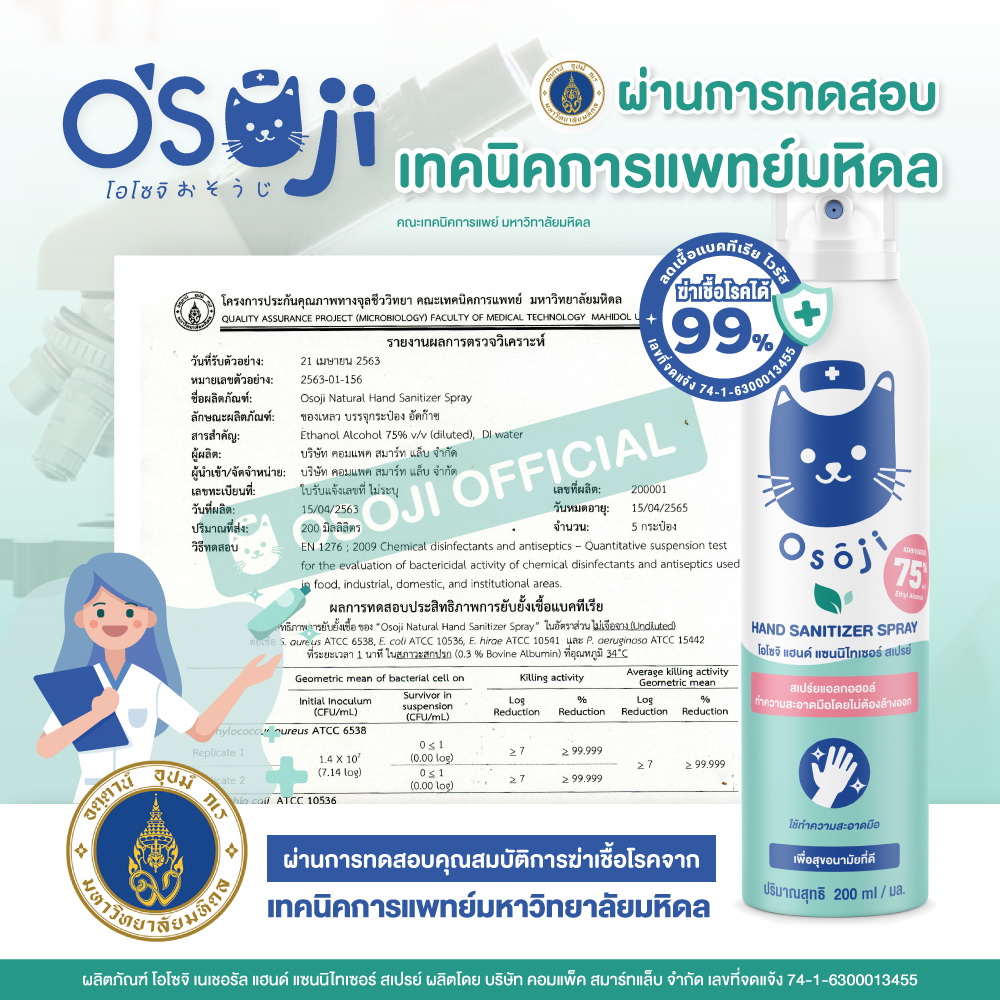 OSOJI THAILAND ยังเพิ่มความมั่นใจต่อผู้บริโภคโดยการส่งตัวอย่างเข้าไปตรวจหาความเข้มข้นของแอลกอฮอล์กับห้องปฎิบัติการกลางประเทศไทย และผลการตรวสสอบผลิตภัณฑ์ OSOJI นั้นมีแอลกอฮอล์มากกว่า 75% V/V ซึ่งทาง องค์การอาหารและยาแจ้งว่าความเข้มข้นที่ต่ำกว่า 70%V/V นั้นไม่สามารถฆ่าเชื้อโรคได้